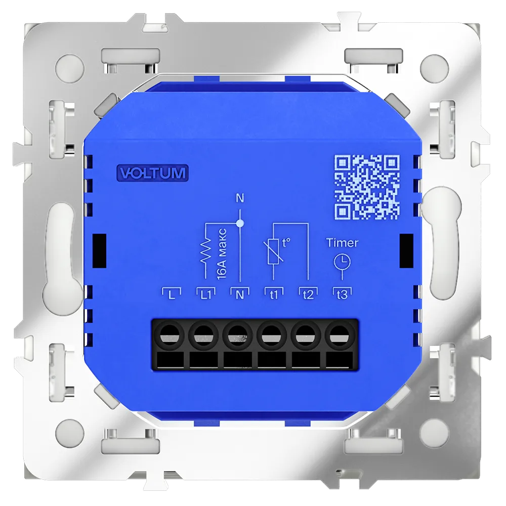 Место установки. Терморегуляторы Voltum предназначены для регулирования температуры электрического теплого пола. Актуальны как в городских квартирах, так и в загородных дачных домах без центрального отопления. Корпус. Дизайн терморегуляторов Voltum сочетается со стилем остальных электрических устройств компании. Они совместимы со всеми рамками. Материал внешних декоративных элементов — поликарбонат. Конструктивные особенности. Терморегуляторы работают с любыми типами теплых полов и рассчитаны на нагрузку до 3500 Вт. Устройства оснащены светодиодной индикацией режима и дисплеем, на котором отображается температура поверхности пола. Красный индикатор — «подача питания на нагревательный кабель (идет процесс нагрева)», отсутствие индикации — «заданная температура достигнута». В течение 15 минут после нагрева терморегулятор переходит в интеллектуальный «спящий режим», уменьшая яркость подсветки цифр и сокращая энергопотребление. Регулировка осуществляется вращением панели управления. Терморегулятор поставляется в комплекте с механизмом из пластиковой накладки и датчиком температуры.